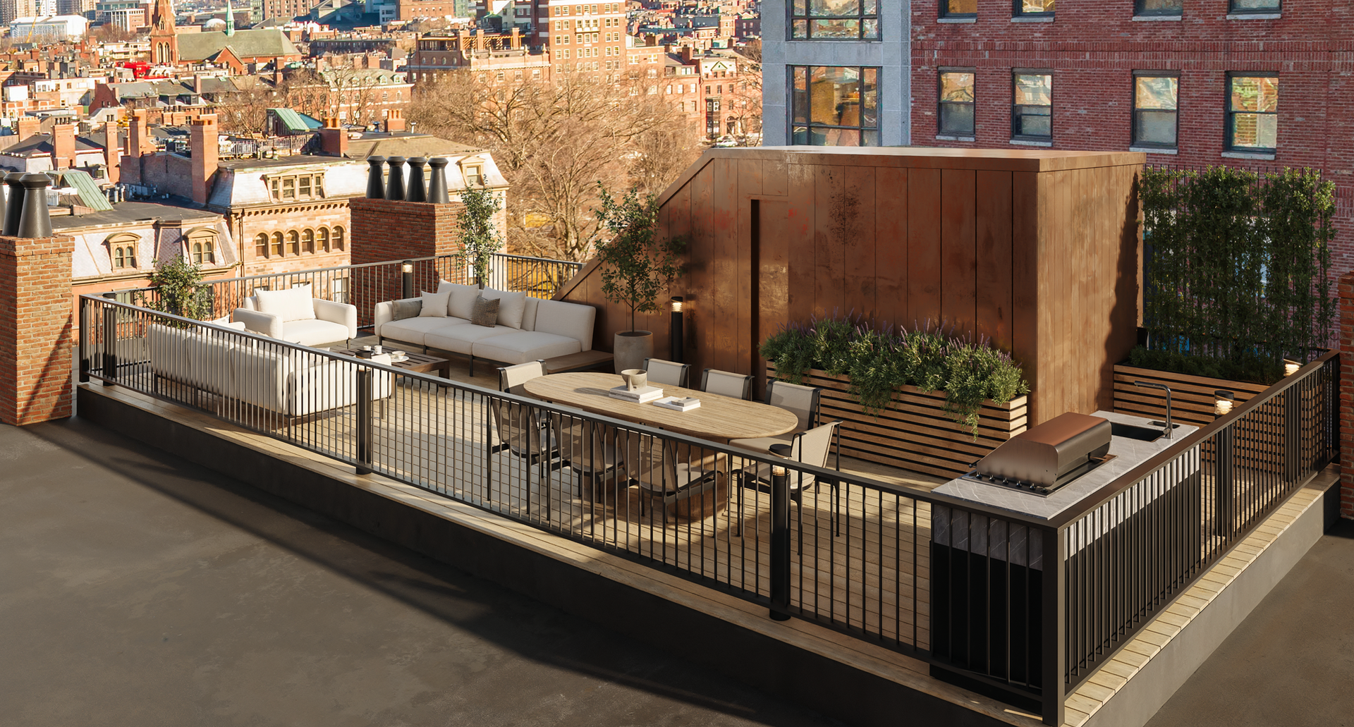 Spanning approximately 8,100 square feet, this exceptional five-bedroom residence offers sophisticated living across five elevator-served floors. Each bedroom is appointed with a private en-suite bath, complemented by two additional half baths for guests. Marble finishes and curated designer selections define each space, while highlighting millwork and custom built-ins express the home’s elevated craftsmanship throughout. Thoughtfully designed for both grand entertaining and effortless daily living, the residence features a two-car garage with two additional off-street parking spaces, along with fully integrated smart-home, alarm, and sprinkler systems. The home is crowned by a private rooftop terrace with a full outdoor kitchen and sweeping skyline views—an extraordinary setting for both elegant entertaining and a quiet retreat.